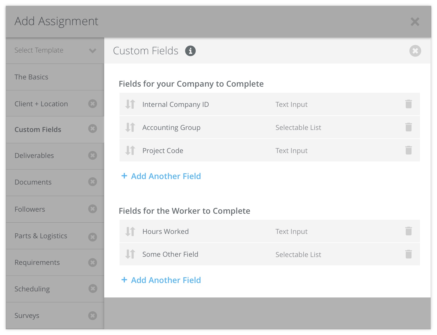 Create custom fields to include assignment attributes that are custom to your company. This can include things like internal company ID, accounting group, project code, etc.