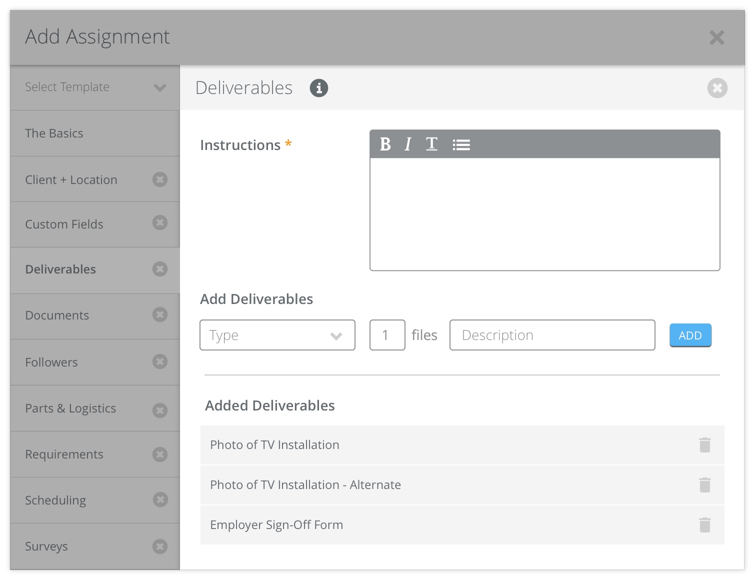 Deliverables can include anything from a sign-off form, photos, documents, and more.