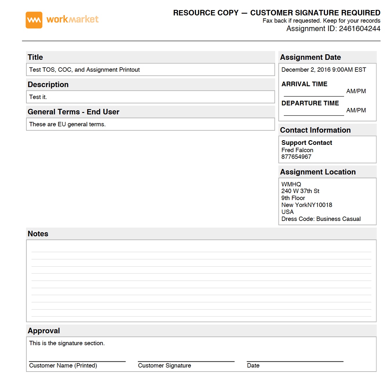 My company elects to use a separate assignment form that can either be a standard printout saved with in the Work Market file manager or individually added to each assignment in the attachment section of assignment creation. This option will ensure the worker prints out my assignment form or my clients rather than the standard Work Market assignment form.