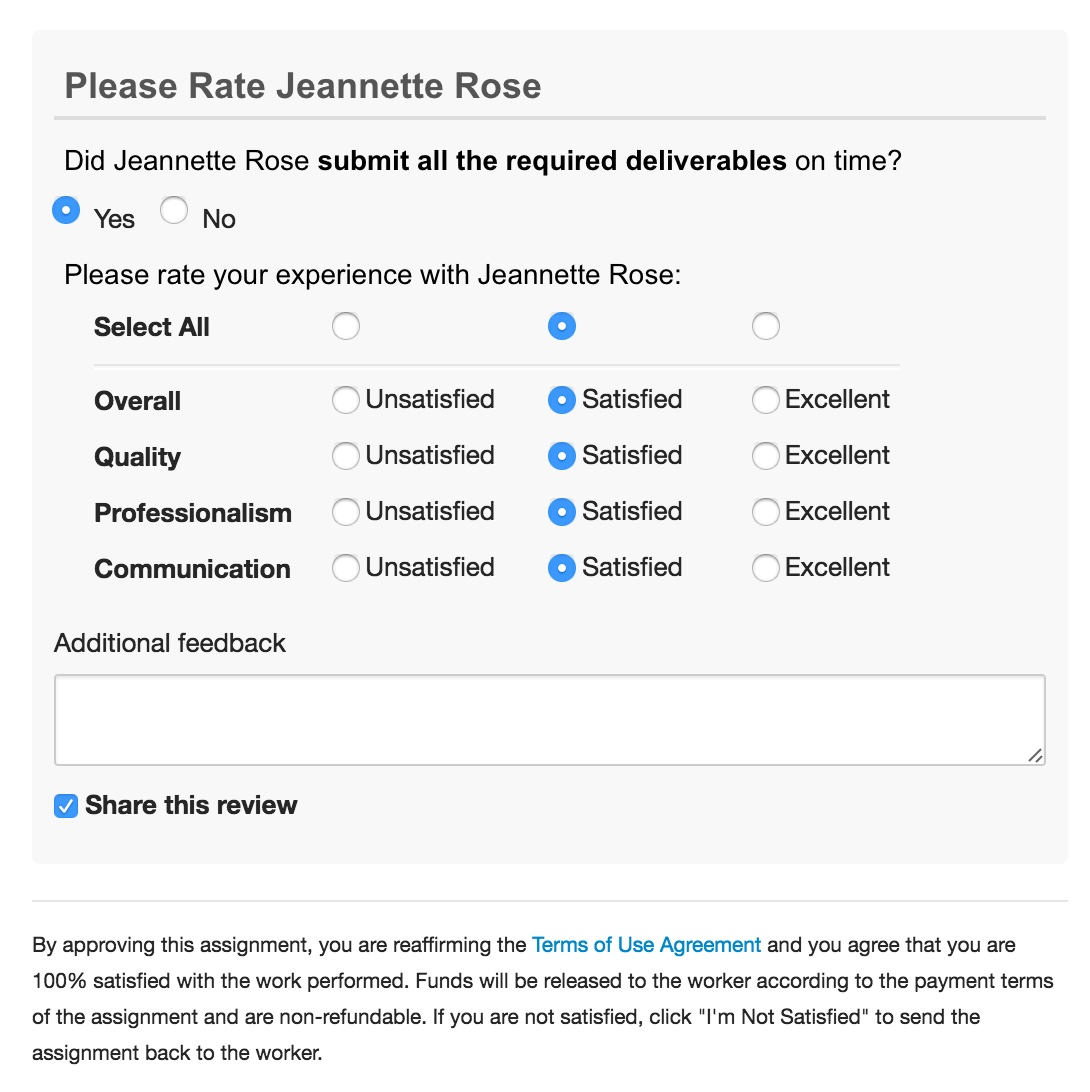 Workers can be rated manually after each assignment is completed, or we can automatically assume a job has been completed to your satisfaction unless you identify otherwise.